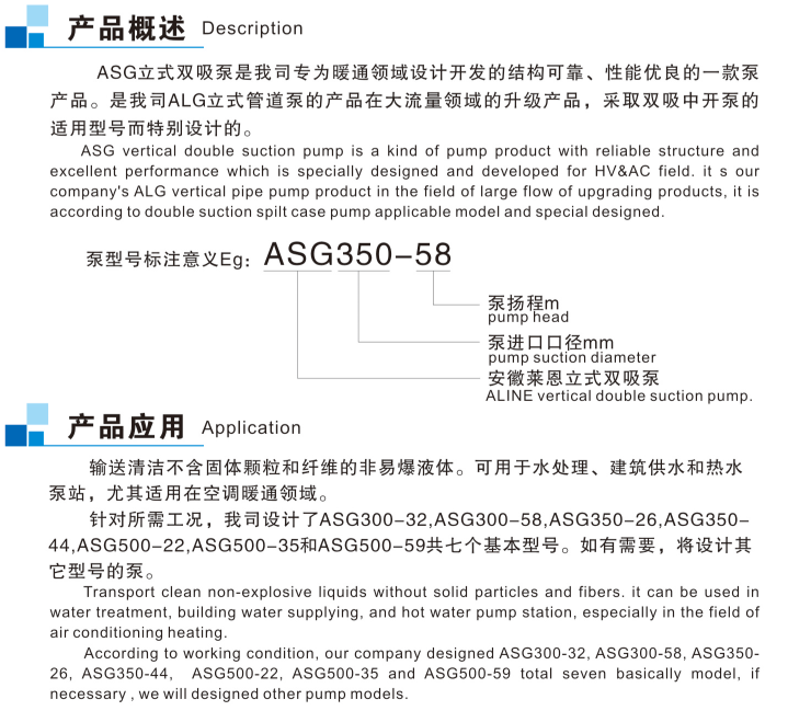 ASG立式双吸泵是我司专为暖通领域设计开发的结构可靠、性能优良的一款泵 产品。是我司ALG立式管道泵的产品在大流量领域的升级产品,采取双吸中开泵的 适用型号而特别设计的。
